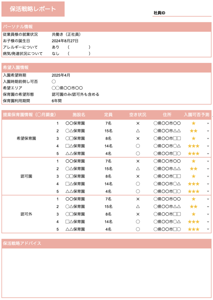 - 育休対象対象従業員様へ個々の保活戦略レポートを作成して提供