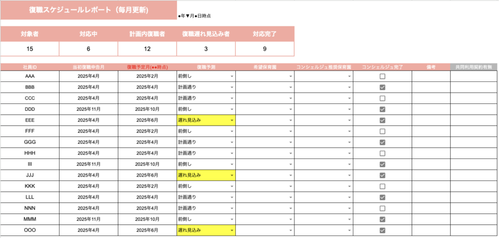 復職対象者の予定が把握でき、適切な組織形成と計画が立てられるようになります。