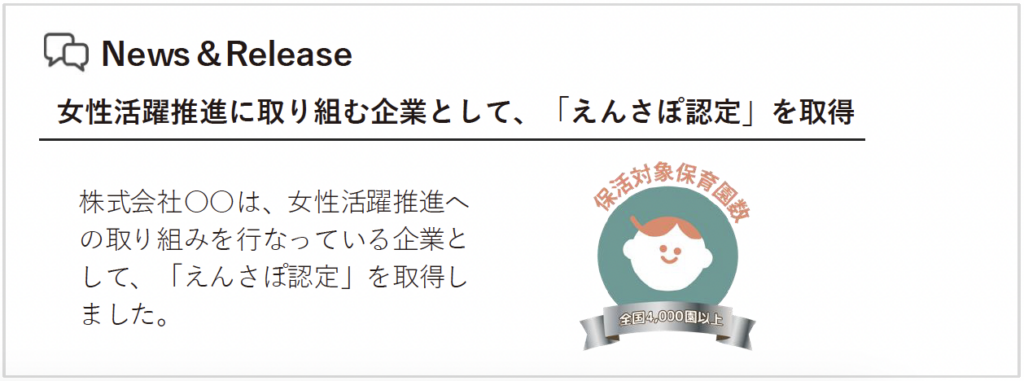 本サービスを導入いただいた企業様へ、えんさぽ認定マークを付与いたします。取得した企業様はえんさぽ認定マークを名刺や求人サイト、HP等へ付すことができ、女性の活躍を推進している会社であることをPRすることができます。